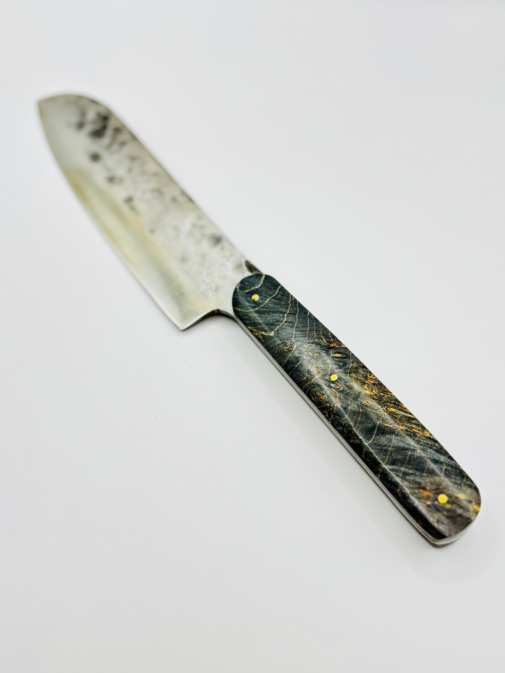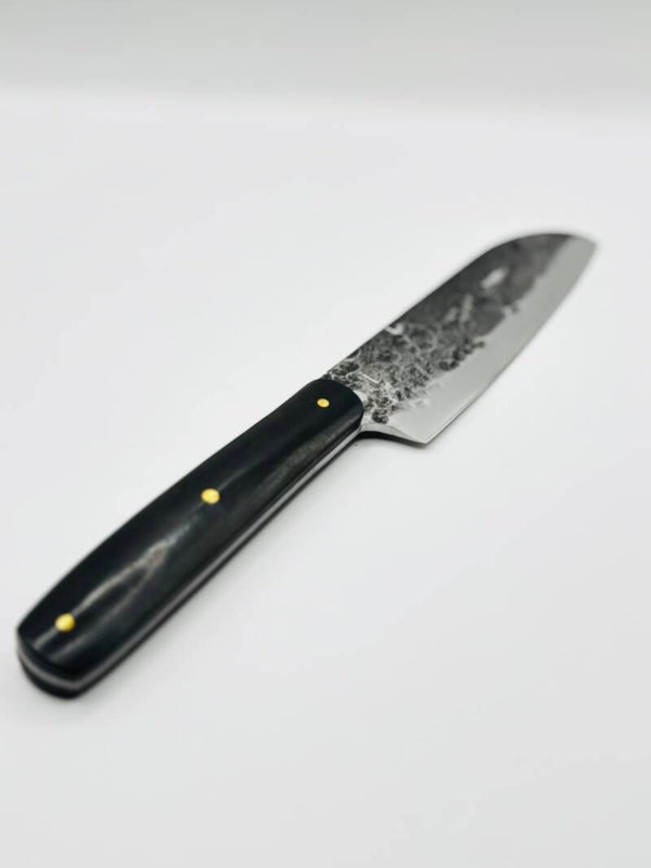 Inspiré de la tradition culinaire japonaise, le Couteau Santoku est un indispensable en cuisine. Son nom signifie "trois vertu", en référence à sa polyvalence : trancher, émincer et hacher. Sa lame large et affûtée, permet des découpes nettes et précises, tandis que sa forme équilibrée offre confort et contrôle à chaque geste.