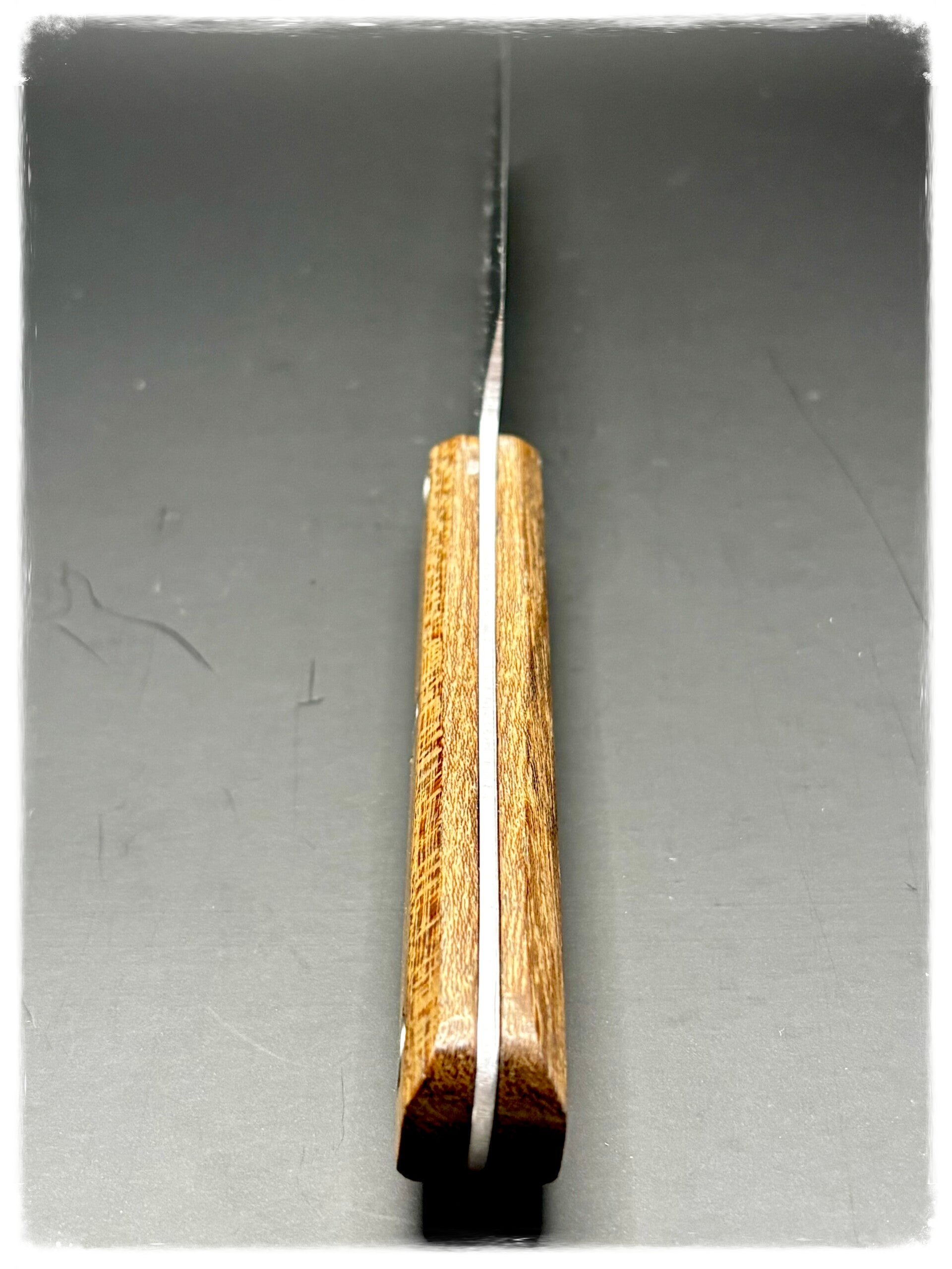 Ce mini Santoku forgé à l’atelier est une pièce compacte, précise et extrêmement agréable en main. Pensé pour les découpes rapides du quotidien, il excelle dans la préparation des légumes, des herbes, des fruits ou des petites pièces de viande. Sa lame en acier XC100, forgée, trempée et affûtée à la main, offre un tranchant fin et durable, idéal pour un couteau léger et polyvalent.